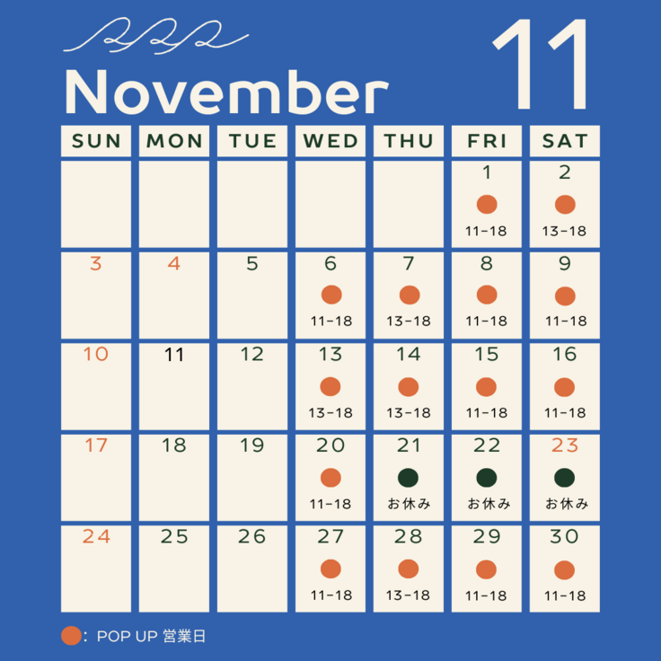 11月のお店びらきについてカレンダーをご案内させていただきます。
