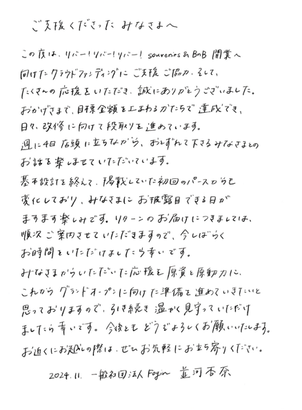 みなさまからいただいた応援を原資と原動力に、これから開業準備を進めていきたいと思っておりますので、引き続き温かく見守っていただけましたら幸いです。