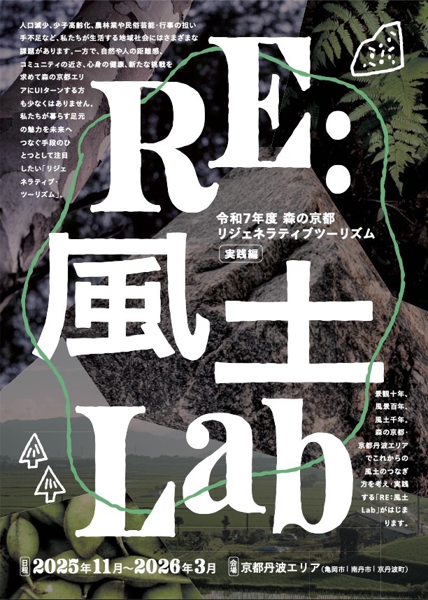京都丹波エリアを舞台フィールドトリップ、レクチャー、ワークショップ、グループ発表会、モニターツアーの開催を含む、全5回のプログラムを企画しています。初回となる11月1日は京都丹波のフィールドトリップです。景観十年、風景百年、風土千年。いま足元にある風土のかたち、これから築かれていく風土のかたち。未来における“地域らしさ”とは何かをともに考え、ともに手足を動かしながら、ともに実践してみませんか。