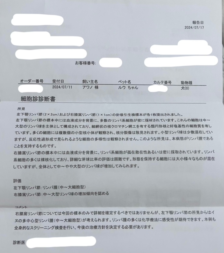 7/17:検査の結果が出て、リンパ腫という血液の癌にかかっていることがわかりました。
