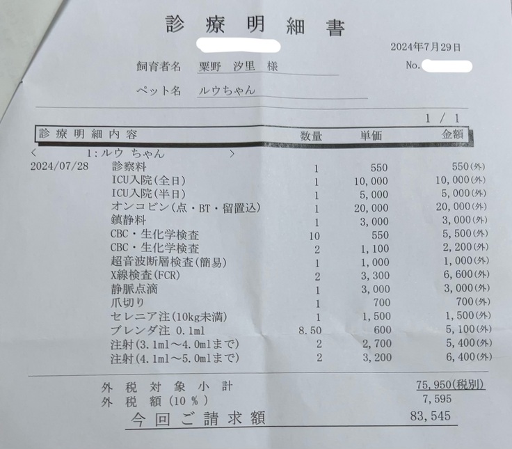 また、リンパ腫の影響で肝臓が悪くなりうまく機能していないため、通院して点滴をしています。肺も弱くなってしまい呼吸を助けるためにICUで入院する日もあります。その他、追加の病理検査や血液検査など毎日の治療でも費用がかさんでいて、3週間で約50万円の治療費がかかりました。