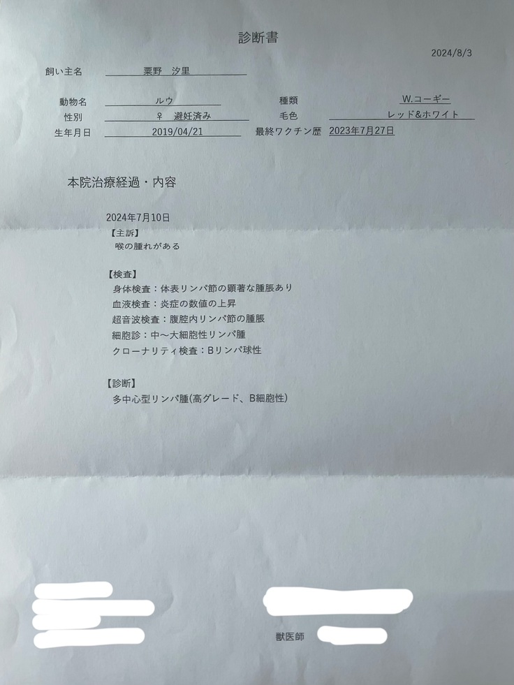 ルウちゃんのリンパ腫の寛解のための今後の治療費にあてます。