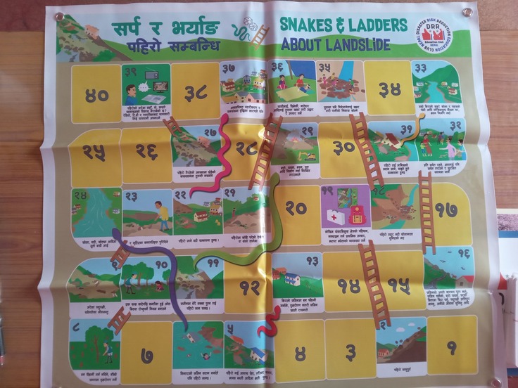また、訓練の中では、「防災すごろく」のゲームを通して災害の際の行動の仕方をゲーム形式で学びました。この防災すごろくは、正式には「蛇と梯子」と呼ばれるインド発祥のゲームを元にしています。ルールはすごろく同様、さいころをふって自分のコマを進め、先にゴールした人の勝利です。蛇のマスには悪行、梯子のマスには善行がかかれており、それぞれすごろくでいう「何マスすすむ、戻る」にあたります。移動先のマスには原因となる行為の結果が書かれており、因果応報について学ぶことのできる道徳教材だそうです。(⇩すごろく写真)