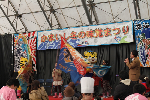 (漁業の復興を伝えるイベントの様子。ラグビーのクラブチーム釜石シーウェイブスのマスコット「なかぴー」と「なかりん」も大活躍!)