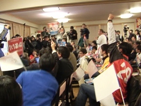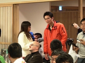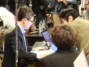 東京本局と携帯電話を繋いでいたNHKさんが、会見がすでに始まっていることを教えてくれました。