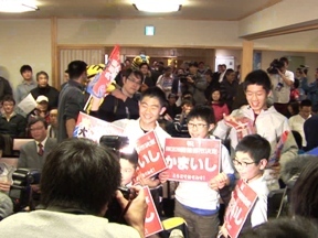 午後10時すぎ、まだ歓声やまぬ宝来館をあとにしました。