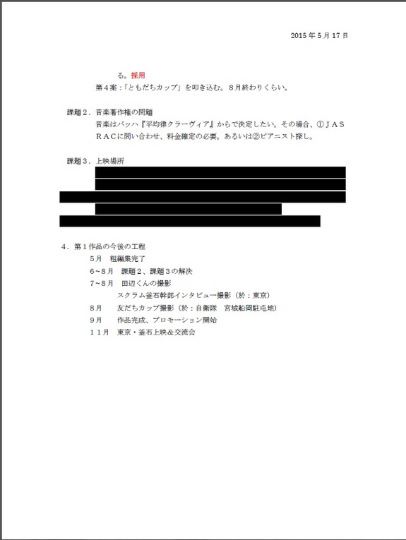 さて、過日出資者のみなさまご案内させていただきました第1作品の拡大編集会議をおこないました。簡単にそのご報告をさせていただきます。