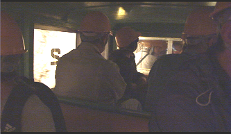 このトロッコで3kmほど鉱山のなかに入ります。一両が対面で6人掛け。天井にヘルメットをガツガツぶつけながら進みます。