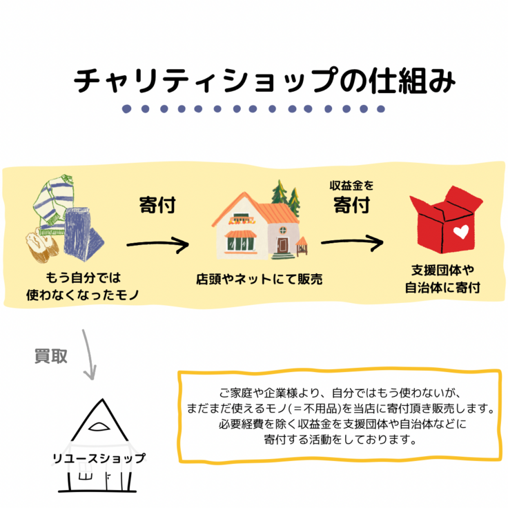 まず、チャリティショップとは、ご家庭など不用品になったものを寄付いただきます。
