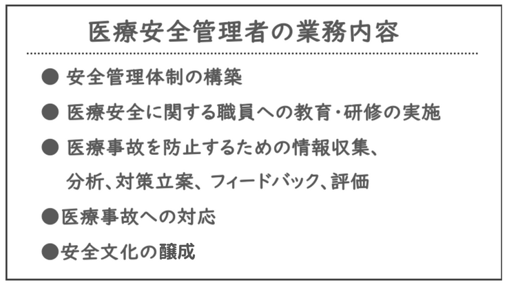 医療安全管理者の業務は、医療機関の管理者から移譲された権限に基づいて、組織全体を俯瞰した安全管理に対する医療機関内体制の構築に参画し、委員会等の各種活動の円滑な運営を支援する。また、医療安全に関する職員への教育・研修、情報の収集と分析、対策の立案、医療事故発生時の初動対応、再発防止対策案、発生予防および発生した医療事故の影響拡大防止等に努める。そして、これらを通し、安全管理体制を組織内に根付かせ機能させることで、医療機関における安全文化の醸成を促進する、とされています。これらをまとめると下の表のようになります。