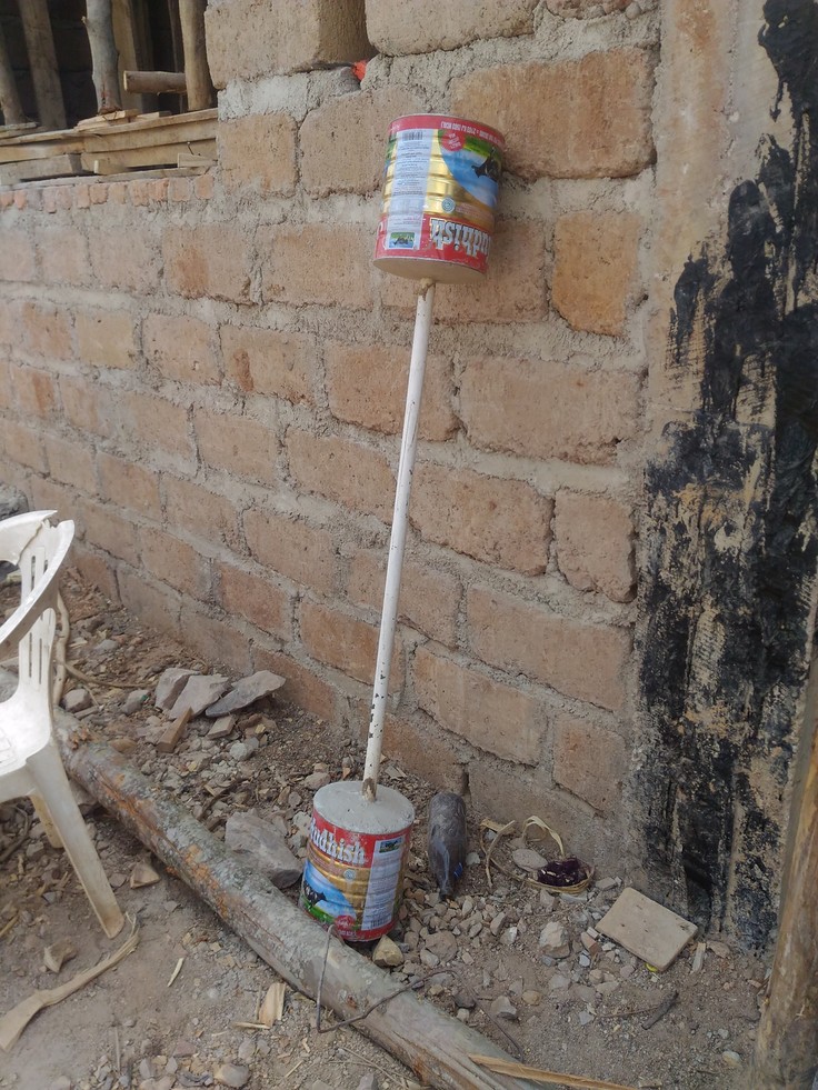これは恐らくコーヒーに入れる粉ミルク(適当な名称がわからない)の缶でしょうな。そこにセメントを流し込む。そして棒を渡す。
