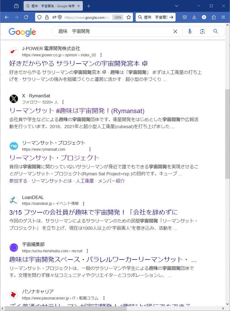 このページを離脱する前に今一度以下のスクリーンショットを見て下さい。これは"趣味 宇宙開発"をキーワードに検索した結果です。