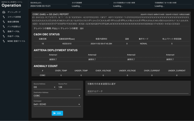 まずは地上局と衛星間での通信確立を行います。衛星へのコマンド送信及び衛星からのコマンド受信を行い、状態の確認を進めていきます。