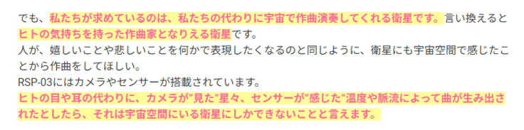 ハモるんの奏でる音楽をお聴きいただくことで、その曲を作曲した宇宙空間のRSP-03をリアルに感じていただければとてもうれしいです。