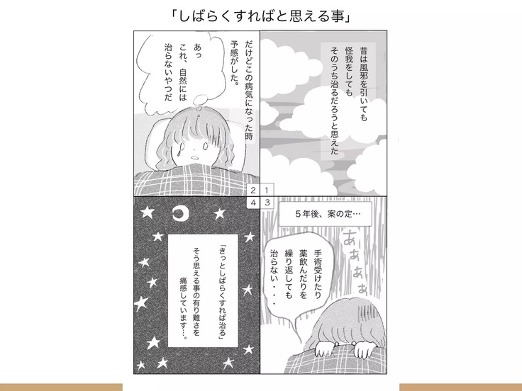 個人的な考えになりますが、脳脊髄液減少症の当事者である私は「いつかは治るという希望を持ちながらも、すぐには回復しないという現実も受け入れ、いまを生きる。」という事が大切だと感じて日々を生きています。