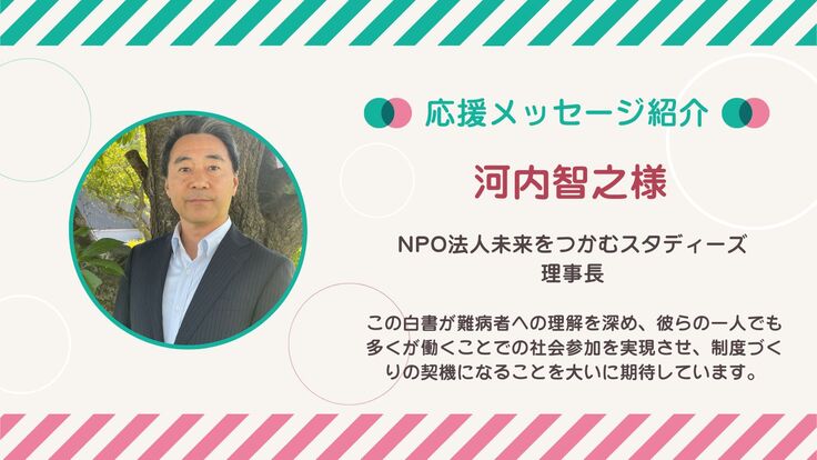 私が目には見えづらい難病を抱えた人と出会って話すようになったのは38歳のときのことだ。それが両育わーるどの重光さんだった。彼は、一見すると分からない激しい痛みに襲われたり、倦怠感に苛まれたりすることを教えてくれて、私もその状況を少しずつ理解していくことができた。それは幸運なことに1年間共に学び、共に過ごすことが出来たからで、もしかするとそれまでの人生でも難病者に出会い、ひょっとすると誰かの生きづらさを増長させていたことがあったかもしれない。この白書が難病者への理解を深め、彼らの一人でも多くが働くことでの社会参加を実現させ、また、そのような制度づくりの契機になることを大いに期待しています。