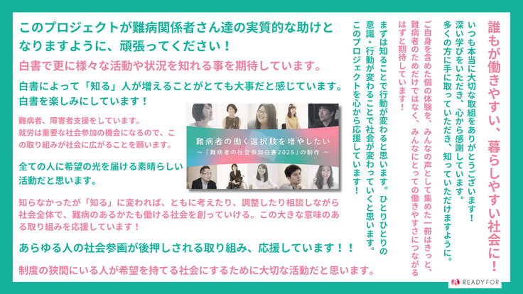 ご支援をいただいた皆さまの応援メッセージや、難病当事者ご自身の想いを拝見して、取り組みを続ける気力をいただいています。目標金額にはまだ遠いですが、難病者の就労・社会参加の機会を増やすために、何とか達成したいと強く思います。私たちは最後まで諦めずに声を上げ続けます。