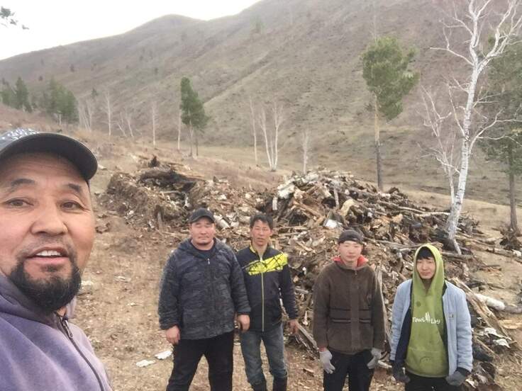山で村の若者と放置された木材を撤去するガンバ氏(左) (2021年5月)