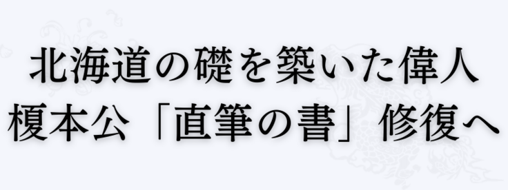 榎本武揚公が北海道開拓への深い情熱を込めて創建したのが北海道小樽市にある龍宮神社で、榎本武揚公直筆の書「北海鎮護」は神社の宝として大切にしてきました。榎本公の生誕190年、没後120年と記念の年でもある令和8年、この書の修復に取り組みたいと考えております。榎本公との関係の深さを示す書の存在は、龍宮神社の宝であり、来年予定している榎本公を御祭神にお迎えするにあたっても大変重要なものです。