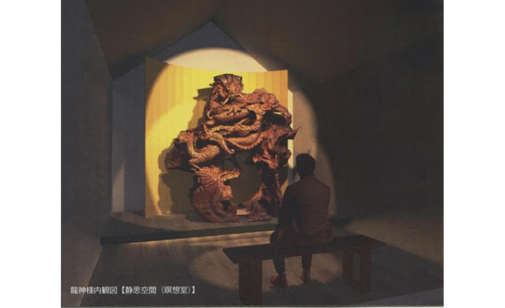 当神社に鎮座されている「龍神像」は一本の木から彫られた巨大な木像の龍神様であり、皆様にとても大きなご利益や力を与えてくれます。この龍神様をお祀りするお社を新たに建立し、お参りに来られる方々が、ゆっくりと心穏やかに参拝し、龍神様を感じながら瞑想できる静かな空間をお造りする予定です。