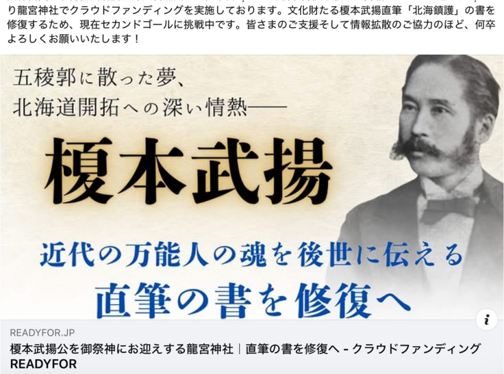 8/31に龍宮神社「榎本武揚の書の修復」のクラウドファンディングについての記事を掲載いただきました。