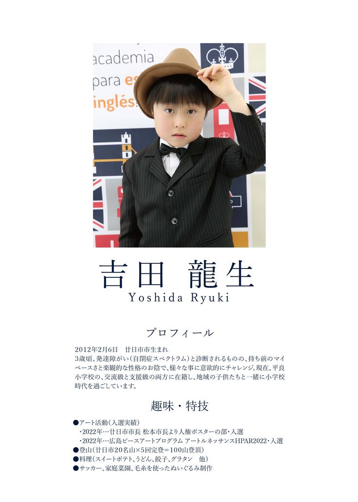 グラフィックデザイナーの吉田浩幸の息子である、ショウガイ・アーティストである『RYUKI』吉田龍生(現在小6)は2012年2月6日に広島県廿日市市生まれ、すくすくと育つものの3歳頃なかなか言葉を発することが出来ず、病院を何件もいった結果、発達障がい(自閉症スペクトラム)と診断される。