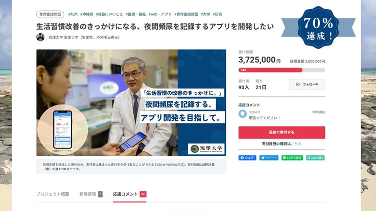 ”夜間頻尿アプリ”開発に向けての本プロジェクトに多くの方のご賛同を頂き誠に感謝申し上げます。2023年5月10日現在、90人の方のご支援を頂き、目標達成の70%を突破することができました!