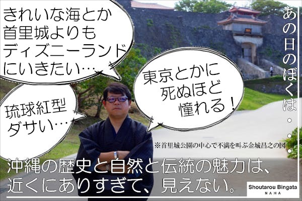 「沖縄のあの透き通った青い海にとっても癒やされるんだよね♪」と言われても、地元の僕たちはちっちゃい頃からその海しか見てないので、なんとも思わないのが現状で、逆に海よりもディズニーランドやUSJなどのようなテーマパークに行きたいです。