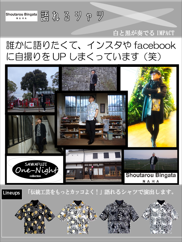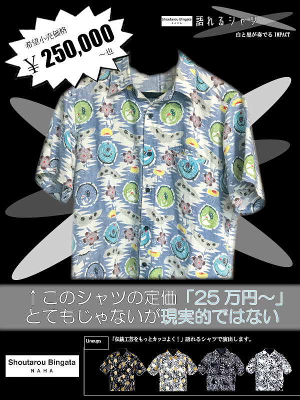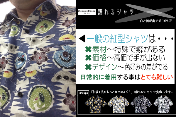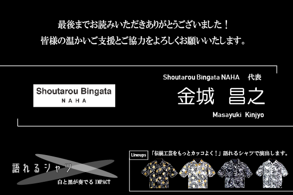 このシャツをきっかけで会話が生まれ、ご縁がつながり、琉球びんがたの魅力、沖縄の魅力が一人でも多くの人に伝わってもらえるとぼくは幸せです。