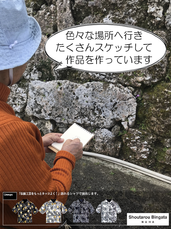 その雰囲気を「語れるシャツ」にのせて、金城昌太郎の想いの込もったデザインを、想いを込めてお客さんに着て欲しい。
