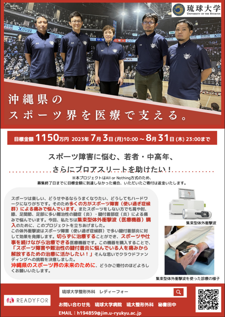 私たち、琉球大学病院整形外科スポーツグループが主体となり、この度、集束型体外衝撃波という医療機器を購入するためのクラウドファンディングをスタートしました!