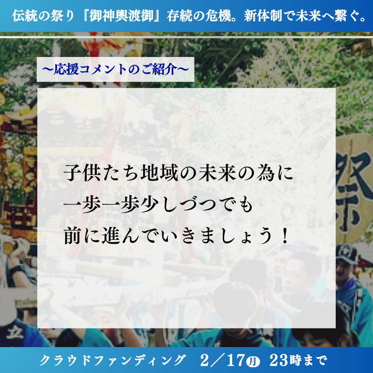 この御神輿渡御を、地域全体で楽しめるお祭りとして育んでいけるよう、さらなる高みを目指して挑んでいます。
