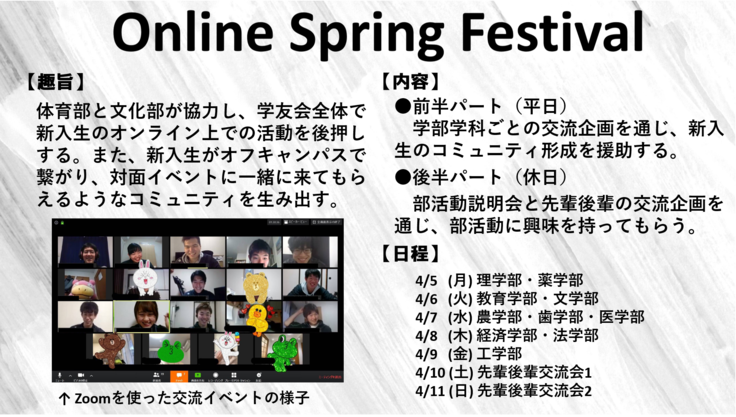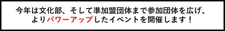 「部活動を通じて "熱狂" を届ける」ために学友会としての一体感を持つためには、より多くの学生に興味を持ってもらうとともに、学友会としての規模を大きくしていく必要があります。そのために、体育部主催で開催した昨年より、参加団体・参加者の対象範囲を広げた体育部・文化部合同新入生歓迎イベントを開催します。新入生同士、そして新入生と参加団体の繋がりを広く生み出すと共に、これからの大学生活を彩るきっかけとなると考えています。さらに、参加の機会をできるだけ多く提供するために、今年はオンラインイベントと対面型イベント、両形式で開催します!
