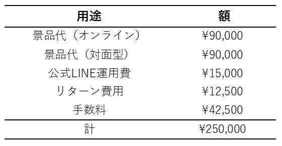 前述のとおり、皆さまにご支援いただいた資金は「イベント景品代」及び「東北大学部活動公式LINE運用費」に利用させていただきます。内訳は以下の通りです。