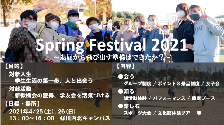 そのため、学友会に一体感を持たせる第一歩、そして春に入学を迎える新入生に大学生活のスタートダッシュを切ってもらうべく、学友会体育部・文化部合同で新入生歓迎イベントを開催します。