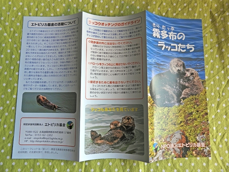 観光地ですからラッコがいることはだんだん知られていきます。新聞やテレビにも取り上げられることもあるようになりラッコ目的の観光客も増えてきたようです。観光に利用すると言う言葉は嫌いですが、観光地にいる以上隠しておけませんし、それで町や住民の関心が高まったり役立てばそれはそれでいいのかもしれないと思い始めています。岬の遊歩道から見たり撮影するには彼らとの距離がとれるので大きな問題はないのです。ただ知られることにより一部のカメラマンによる好ましくない行為も見られるようになりました。そこで町とも相談しラッコが安心して暮らせ観光客にも楽しんでもらえるようなガイドラインを決め、リーフレットをNPOで作成し配布を始めています。町にも呼びかけた結果、危険がある場所にはロープを張り遊歩道から外れないような措置をとってもらいました。春には遊歩道の入り口にガイドラインを書いた看板が設置されることになっています。