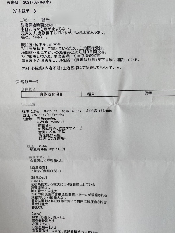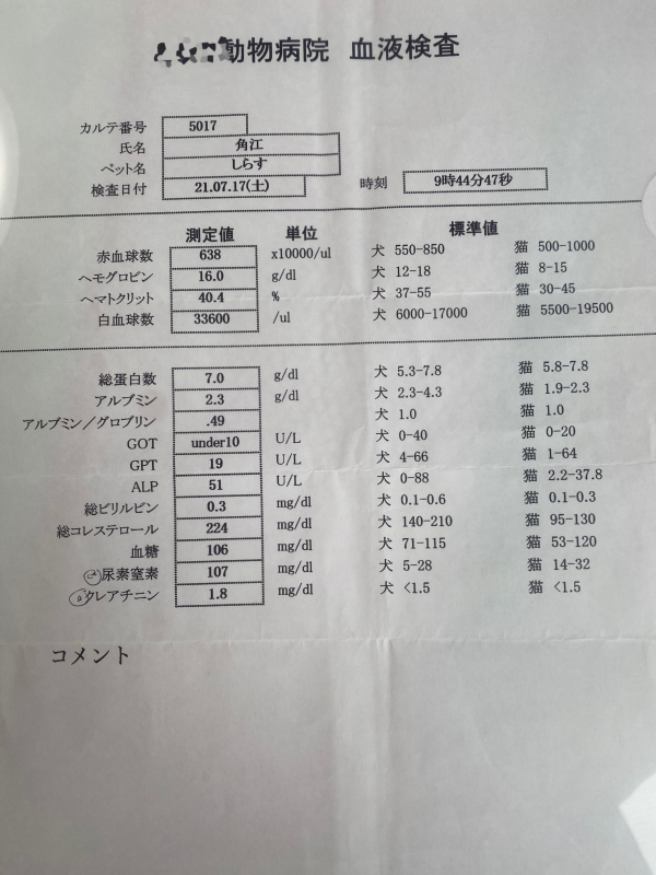 多飲多尿の症状が見られ、7月17日に再診した結果、腎臓病が発覚しました。