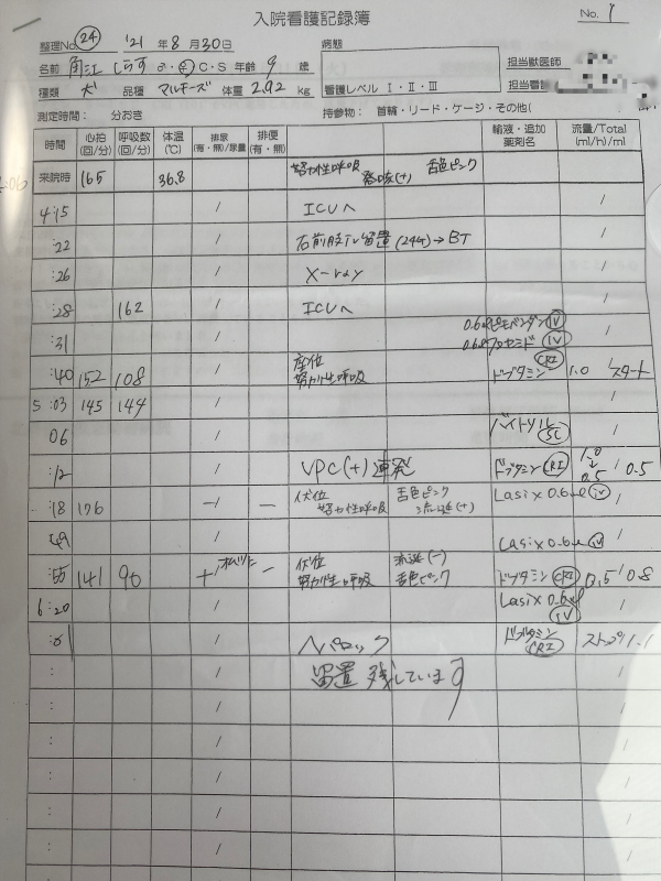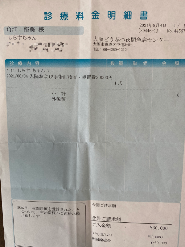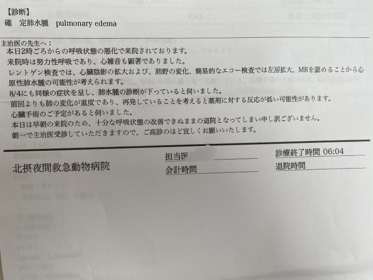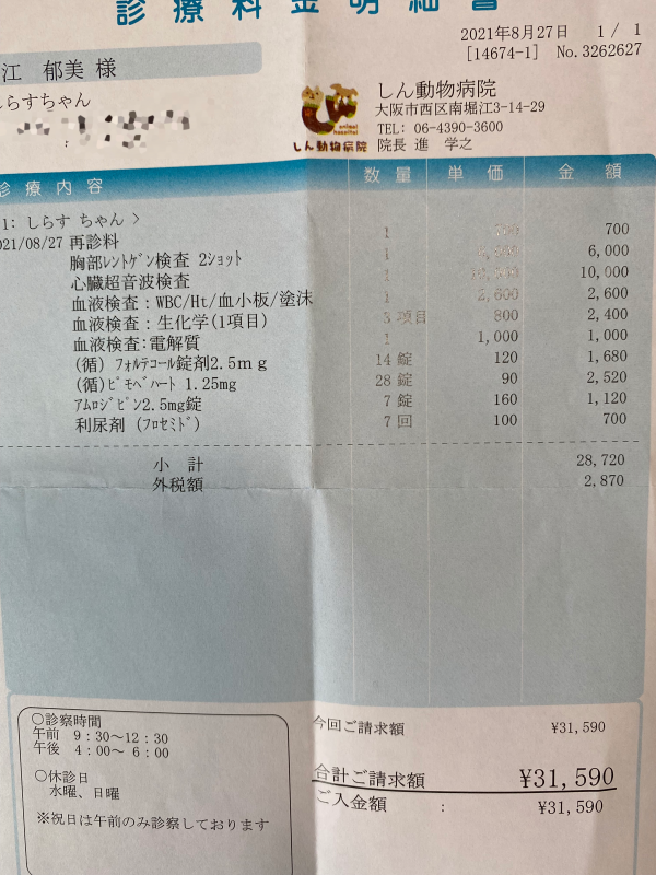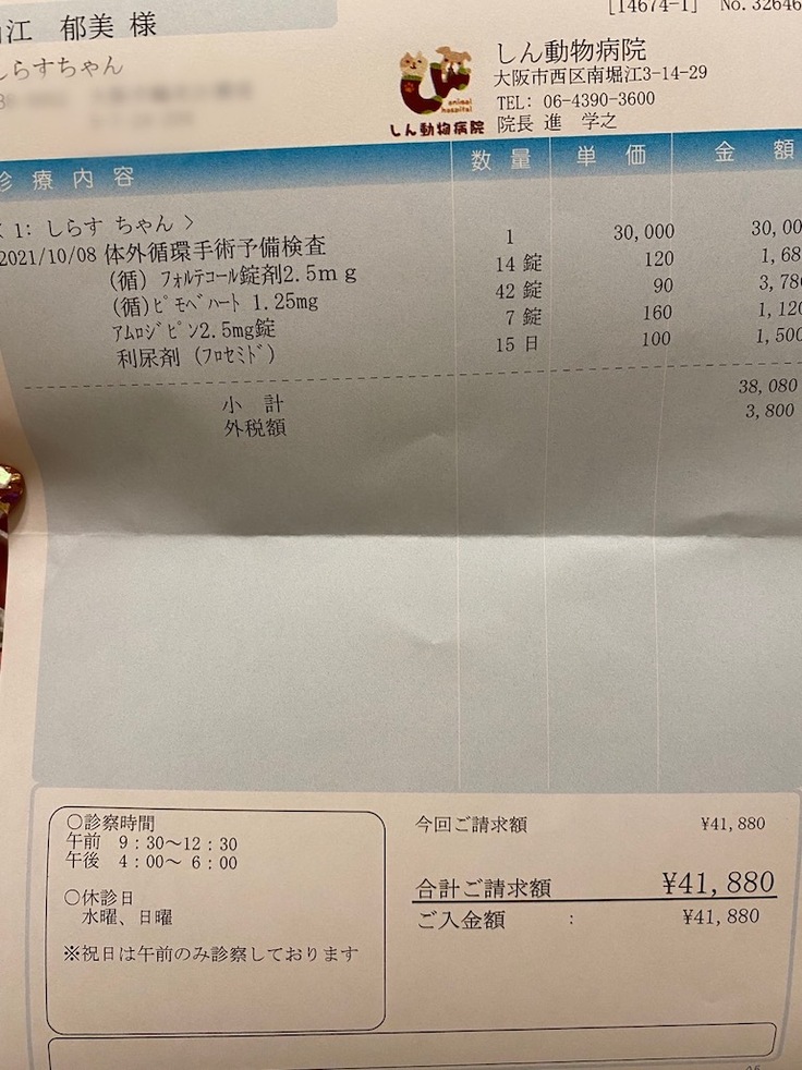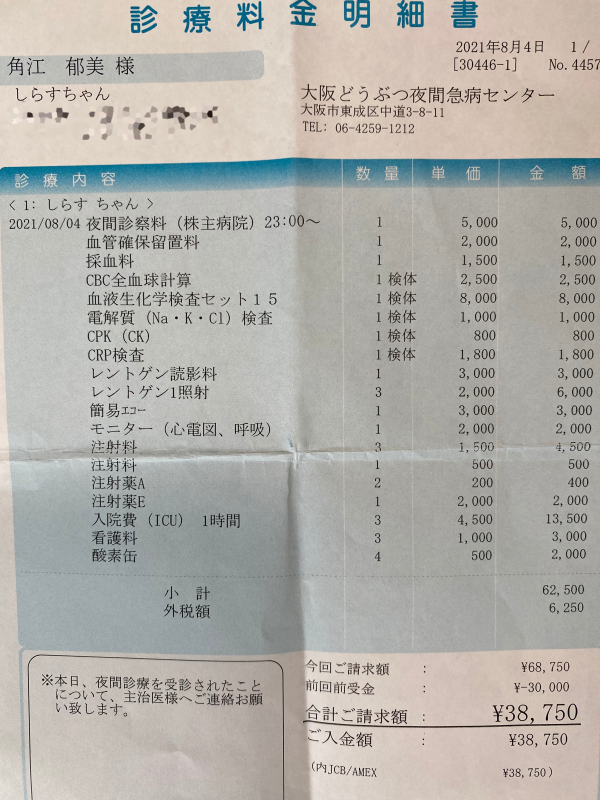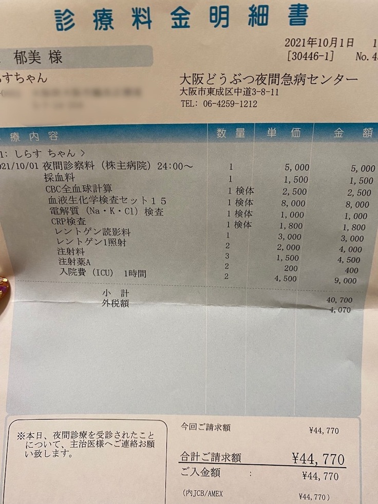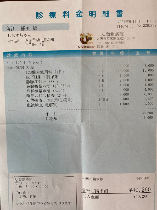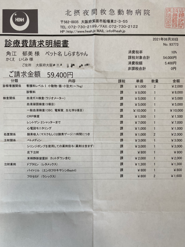 3度目の肺水腫(10/1)で急変を起こして夜間救急の受診や、かかりつけ病院の再診などで費用がかかっています。
