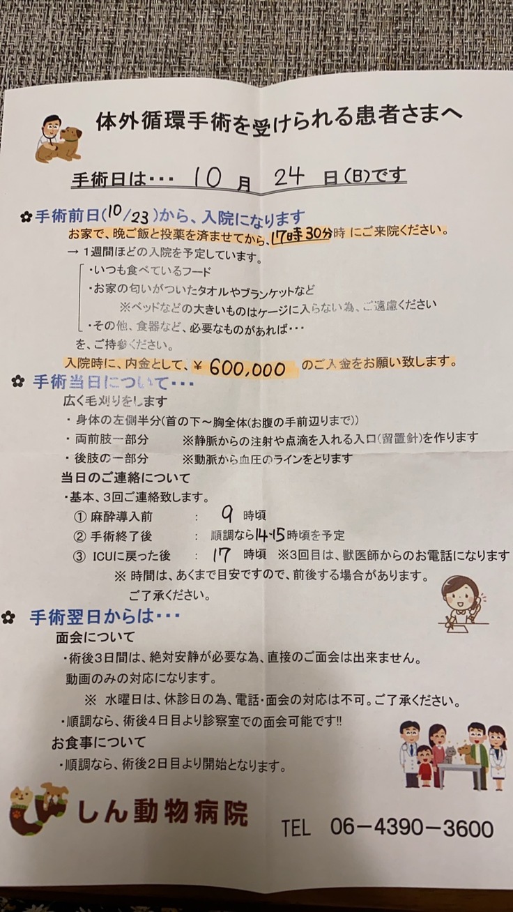 実際には手術費用が120万円(輸血量や術後の容態で変動あり)、術前術後の検査費用が10万円ほど、その後の定期検診(1.3.6.12ヶ月)が10万円ほど、3ヶ月検診までのお薬代(12週間分)59000円ほどで、多くのお金が必要になります。