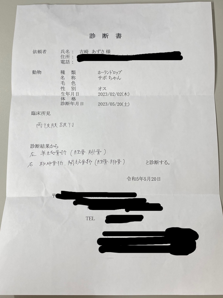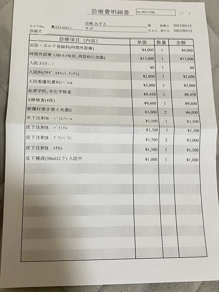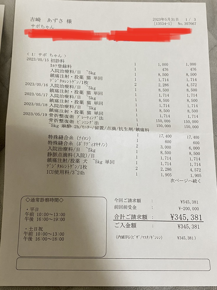 後ろ足両足骨折で60万+安静時期2ヶ月ペットホテルにお預けで1日4000円なので60日で24万円が状況によっては必要となります。