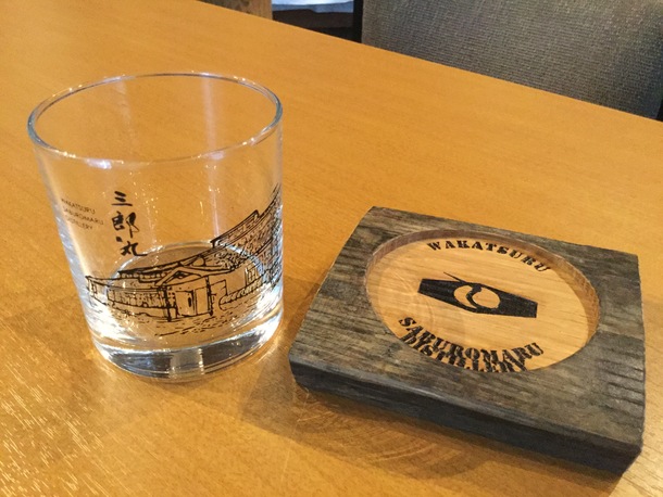 三郎丸蒸留所オリジナルグラスとオーク樽材でつくられたオリジナルコースターのセットです。コースターは南砺市にて樽から家具をつくられる職人さんに作成いただきました。デザインは樽の意匠を取り込み、ロゴは高岡漆芸による漆塗りとなります。