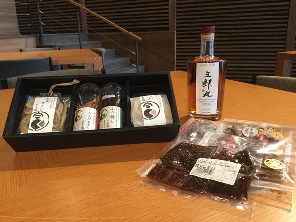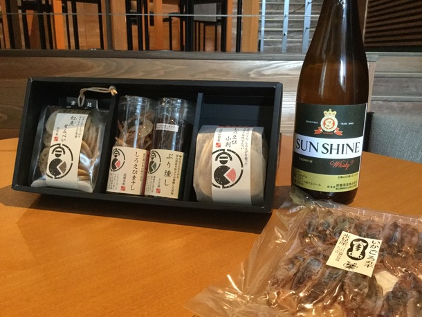 今年度に発売を予定しているブレンデットウイスキー「サンシャインウイスキープレミアム」と富山のおつまみのセットです。