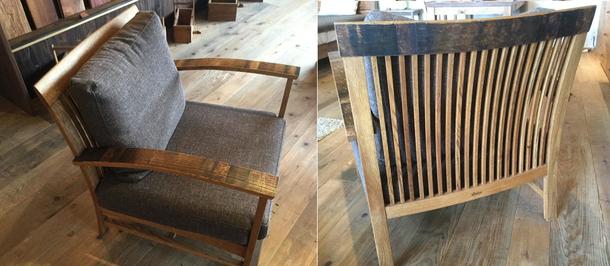 三郎丸蒸留所の樽材を使用してソファーを作成いただきます。樽ならではの重厚感と曲線が魅力です。クッションは自家縫製というこだわりの逸品です。