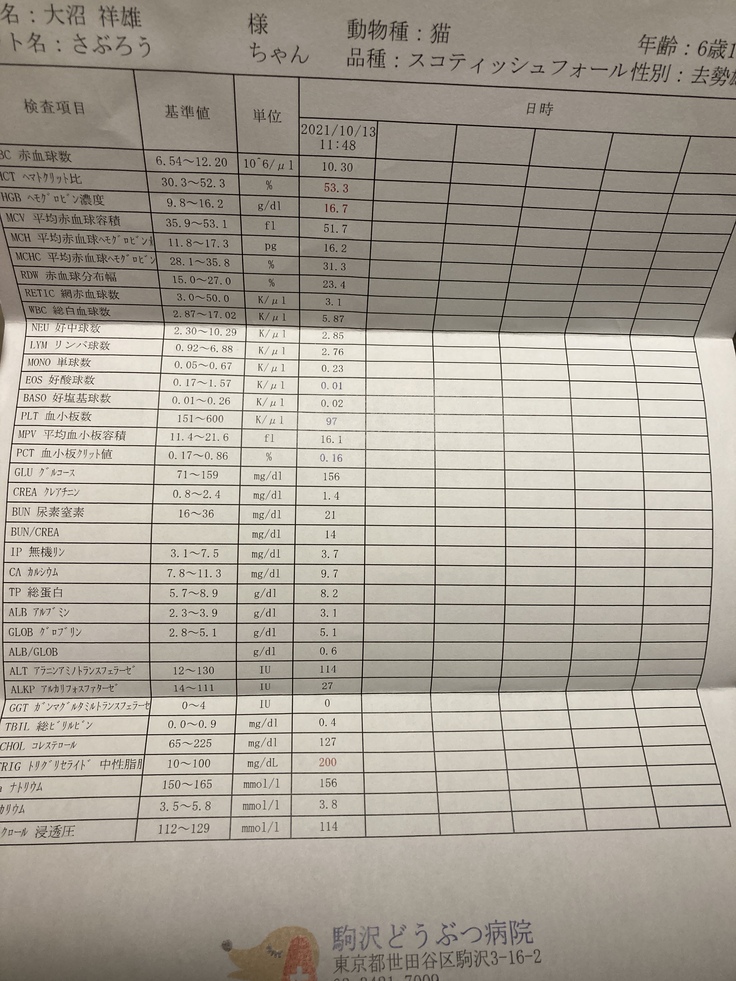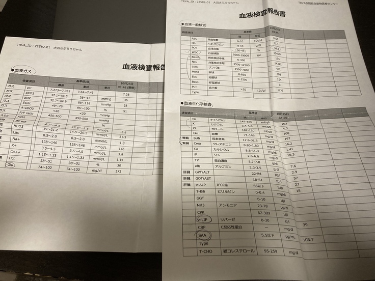 10月の上旬あたりから急に食欲不振、水も飲まず、元気がないといった異変があり、かかりつけの病院にて診てもらいましたが、その時点では血液検査も心臓エコー検査も異常は見られず、おそらくは内臓のどこかに炎症があるのではないかということで、それを抑える点滴と食欲増進のために注射を射っていただきました。