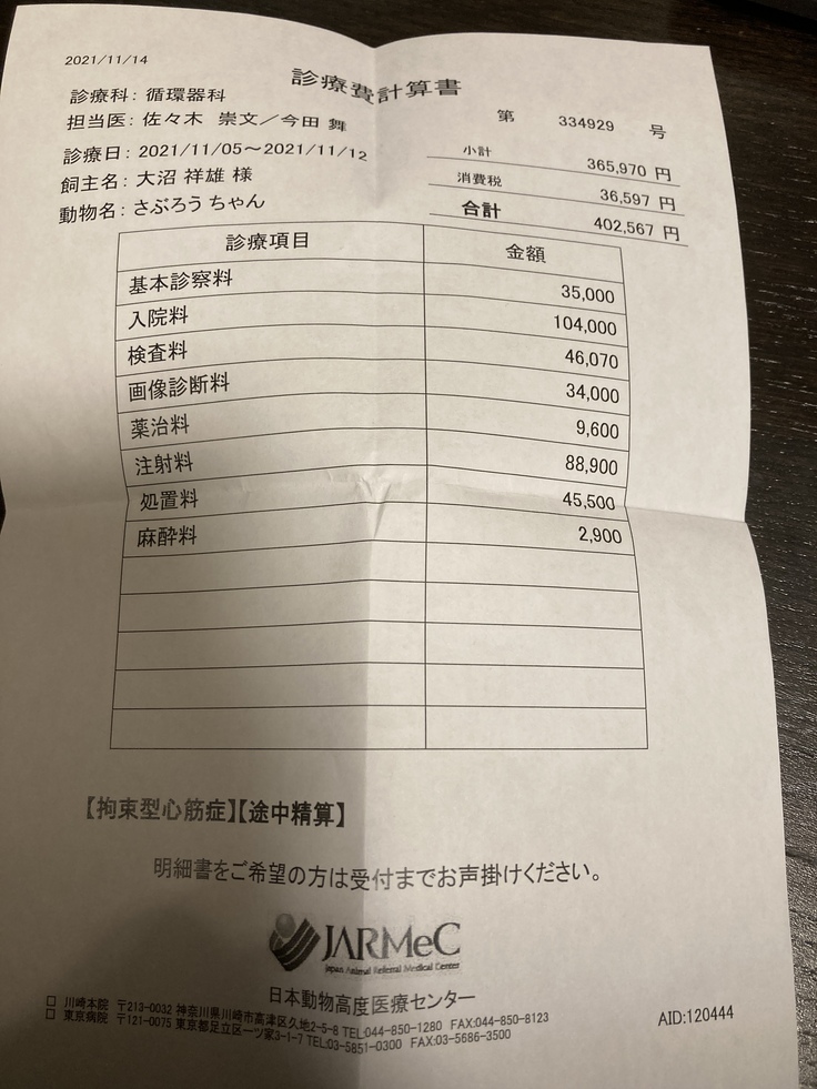 あまり考えたくはないですが、万が一亡くなってしまった場合もそれまでかかった治療費、供養の費用など、さぶろうのために充てさせていただきます。