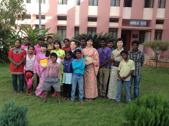 一昨年 福島の少女と、福島のお母さんたちといっしょにインドに行って絵を描きました。さかぐちさんは、左緑の着物を着た方です。ちなみにサダコ役を演じたりあんさんも。