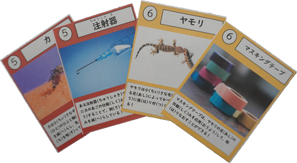 今回、私たちが製作して寄贈・提供しようと計画している教材は、バイオミミクリー・トランプです。基本はトランプの枚数と同じく、13枚のペアが2セットとなっています。遊び方は簡単で、トランプを裏返して同じ数字をそろえる神経衰弱です。神経衰弱は、数字が同じ物がそろうと、自分の物になるという遊びですが、このバイオミミクリー・トランプでは、1セットが生き物の写真、もう1セットが科学技術や製品の写真となっています。この2つがなぜセットになるのか。その仕掛けがバイオミミクリーです。