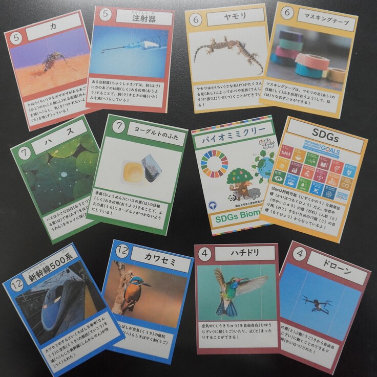 このバイオミミクリー・トランプで遊ぶことで、生物模倣を知り、SDGsの目標9「産業と技術革新の基盤をつくろう」、目標14「海の豊かさを守ろう」及び目標15「陸の豊かさも守ろう」につながる意識を小学生に持たせることができると考えています。この教材には、生物模倣の例が全部で26種類紹介されています。この26種類が生物模倣の全てではありません。この教材での体験を通して、生物模倣を知ってもらい、もっと他にもある生物模倣を調べていくことで、新たな生物模倣を見つける。日常生活で使われている科学技術にはどのような工夫や特徴があるのか調べようとする。生物の観察を行い、その特徴や形態を調べようとするなど、ただ遊ぶだけではなく発展的な学習にもつなげることができます。