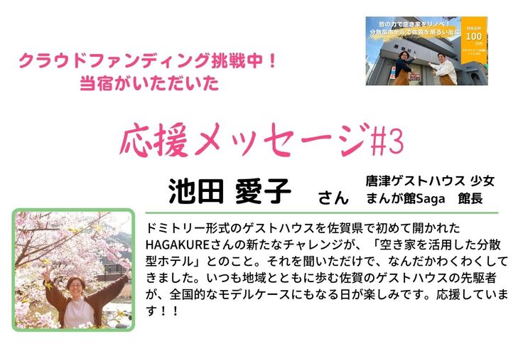 唐津でまんが館兼喫茶兼ゲストハウスを営む”唐津ゲストハウス少女まんが館Saga”館長の池田愛子さんに応援メッセージをいただきました。