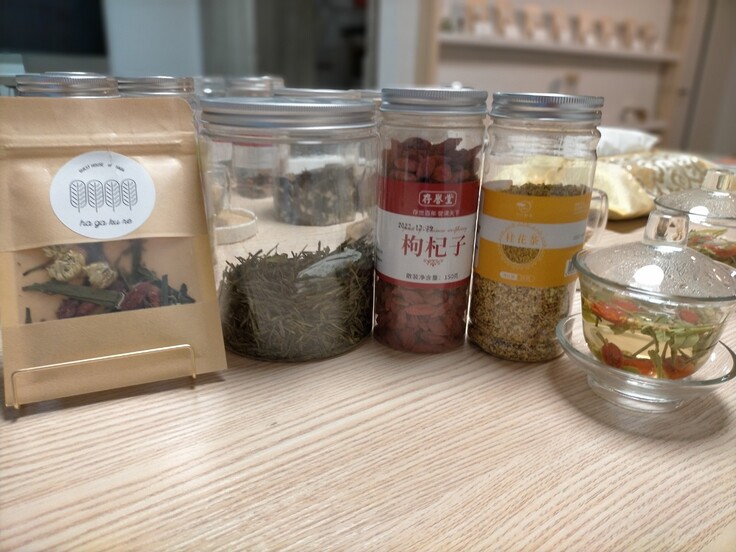 中国花茶館ではちゃおずさんが毎月ブレンド花茶を用意して提供してくれます。こんなにたくさんの種類から味・色・形・効能などのバランスを考えてブレンドされていました。